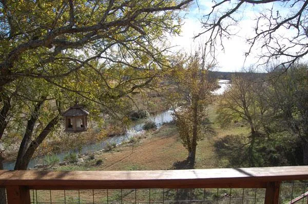 --625 sq ft rustic cedar cabin located in Pecan grove with bluff behind and river in front.