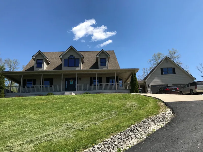Beautiful views and move-in day of closing! This gorgeous home surrounded by trees and privacy has an amazing view from the wraparound porch. You can enjoy the 9 acres m/l or you may choose to sell off some of the surveyed lots. You will love the knotty pine walls and river rock fireplaces. Walk in house to view vaulted ceilings in the great room. Remodeled kitchen with stainless steel appliances and lots of cabinet. This home contains 4-5 bedrooms with the master bedroom on the main level with a whirlpool tub, shower and vanity for two. Upper level has two large bedrooms with huge closets and extra storage. The lower level (walkout basement) has two more large bedrooms, huge family room with river rock fireplace, second kitchen and full bath. There is a basketball court in the back. Also has a detached carport for your boat or motor home. Lots of room to add a pool or anything else to e...