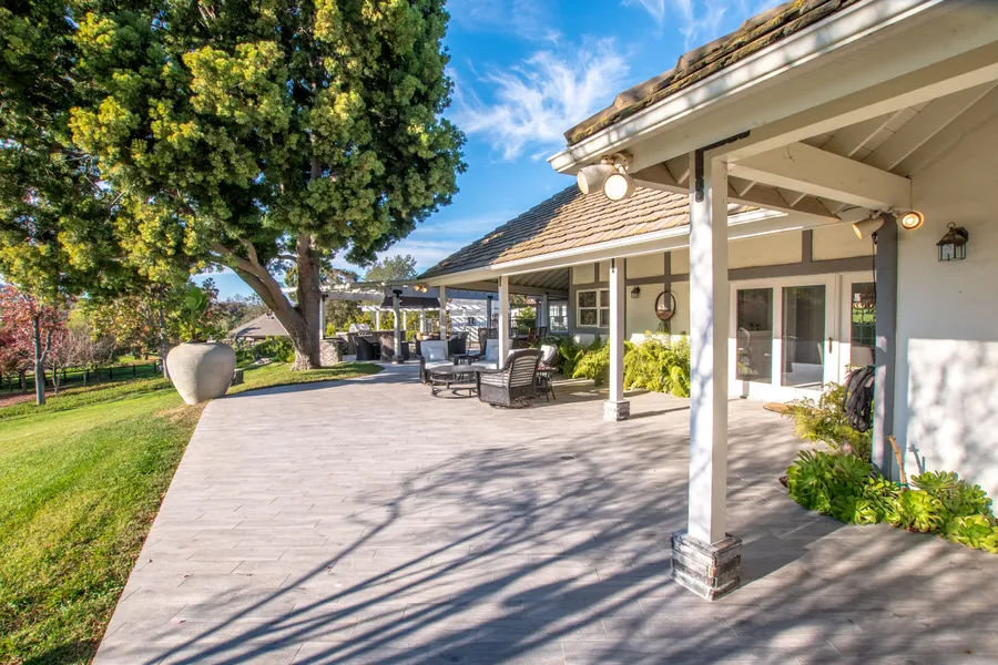 Behind the gates of Rolling Hills Estates in South Fallbrook, this single-level 3 bedroom, 3 bathroom home offers an elegant yet relaxed country lifestyle. This property is located within the equine side of Rolling Hills, directly adjacent to the private horse trails, allowing up to 4 horses. Set in a quiet, park-like environment with mature trees, pond and open skies, it feels wonderfully private and tranquil while still being part of a sought-after, guard-gated community. The home basks in natural light and enjoys bountiful garden views from every window. Thoughtful recent upgrades make the home modern, stylish, and welcoming, including a solar system and 2 Tesla walls, whole-house water treatment, modern color palette, and updates to plumbing and electrical, all complemented by tasteful decorative fixtures and finishes throughout. Large, open rooms flow easily to the outdoors through multiple access points, creating an ideal setup for entertaining and everyday living alike. For those who love to host and unwind, the expansive patio invites gatherings around the fire pit while guests take in the westerly sunset views, extending the living space well beyond the interior walls. With generous space for horses, direct access to a connecting horse trail, and room for dogs and other furry friends to roam, this property beautifully blends refined country living with an inviting, social atmosphere.