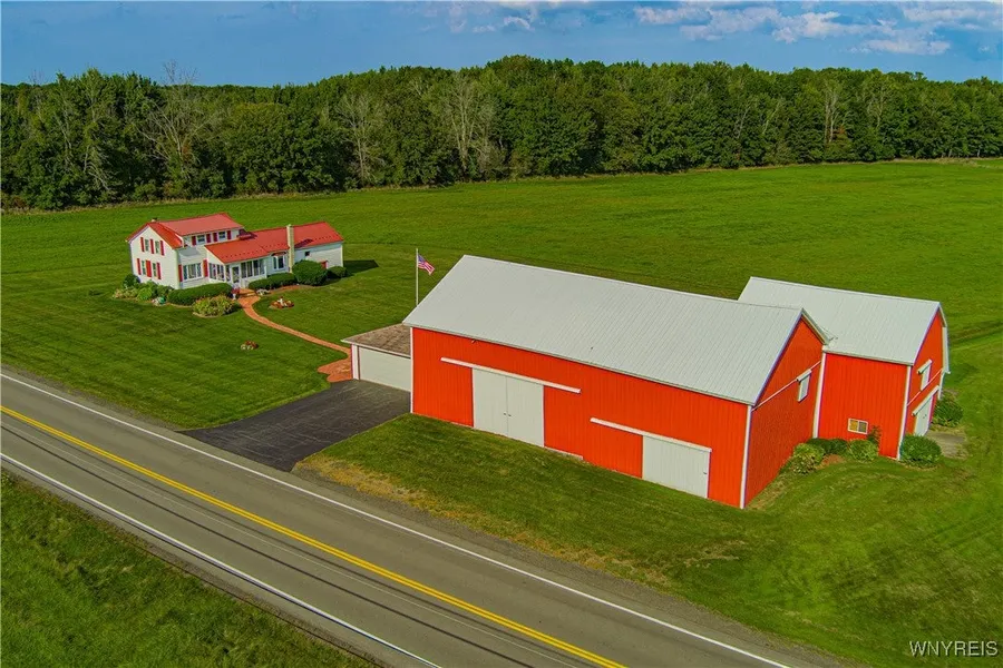 Town of Royalton Fabulous farmhouse with 90 Acres. Detached garage and barn! Akron Schools! 3 bedrooms 1 full bath. Open kitchen, family room and dining room. First floor laundry. Enclosed front porch. Clean dry Basement with a loft for storage and access to the outside. Detached 2 car garage. Metal barn with 1.5 stories. 5 acres of woods along the back of the property. Metal roof on house and barn approx 2015. Furnace and HWT 2024. Septic is newer approx 15 years. Property can be broken into House, barn, detached garage and 40 acres..$350,000.00. 35 acres $225,000.00 and the lot across the street approx 16 acres $99,000.00. See MLS#s B1572172, B1572059, B1572205.