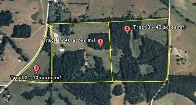 TRACT #1 - 40 acres m/l joining C Hwy. by way of a 40' x 64' owned entrance from the highway. This tract has a 40' x 48' metal barn shop with power, concrete floor, double doors, new power lines, new $9,000 well! 30' x 100' equipment or hay barn with a 6' x 30' concrete floor tack or tool room, water is to both barns. Note: This tract has a beautiful building site on a knoll between the 2 barns and overlooking the fields and woods to the east. AND! There is a gorgeous grove of tall, mature pines on the south edge of this tract! 50% wooded, 50% open, lays level to rolling, 2-3 ponds. TRACT #2 - 10 acres m/l with approx. 1/4 mile of C Hwy. frontage, mostly open with a nice pond. Excellent building site! TRACT #3 - 40 acres m/l, 40 % open, 60 % wooded, joins County Road 251 for a 1/4 mile on the east side, 2-3 ponds, lays level to rolling, very nice pastures with trails through the woods from field to field. Terms: 10% down day & location of auction, balance due at closing in 30 days or less. Property sells "as is, where is". Property sells without contingencies of any kind such as loan approval, appraisal, sale of other property, etc. Come ready to buy & close! Title seach paid for by Sellers, title insurance policy paid for by Buyers, balance of normal closing costs split evenly.