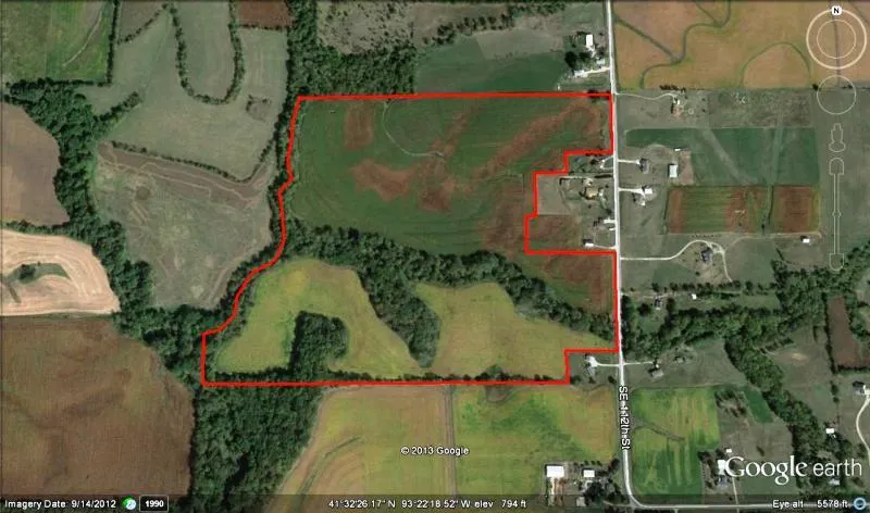 92 aces m/l of productive Polk County land for sales at auction on June 7th 2013 at the Runnells Historical Society (former Church of Latter Day Saints) at 10am. Land includes approximately 72.6 acres m/l tillable with a weighted average CSR of 61.7. Balance of the farm includes a timber draw that backs up to a creek. FSA reports 74.5 acres Cropland, 50.2 acres corn base with Direct and CC yield of 108, 24.3 Soybean base with Direct and CC yield of 30. Actual FSA acres will be determine by FSA office after sale.