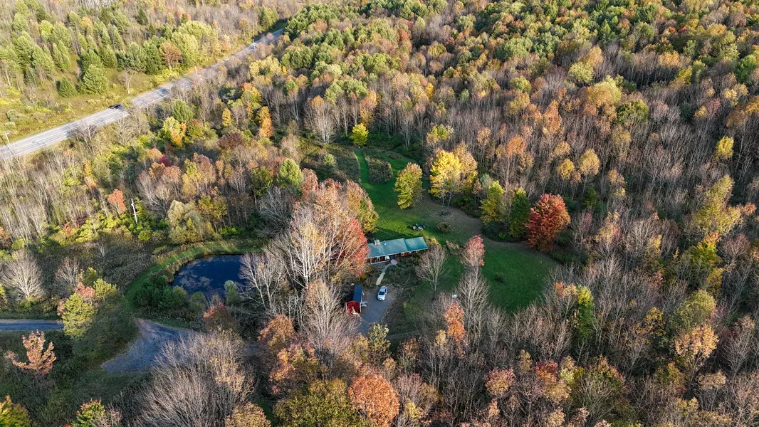 This 125-acre parcel features front footage on US Rt. 20 with the cabin and a main pond tucked in, hidden above the road making the property both private and accessible year-round. The cabin is move-in ready. Whether you are looking for a family retreat, hosting a hunting party or you plan to offer it as a short-term rental, its fully equipped to accommodate your needs. There are 2 bedrooms, and also a bonus room w/ a pullout chair (twin bed) & a pullout couch (double bed). The living room features a leather sofa & chair/ottoman combo in front of the wood-burning stove. A large flat-screen Roku TV & a table that seats 6 are the perfect places to gather. Full bath w/ shower includes a washer & dryer. The kitchen is fully equipped with a full-size refrigerator, induction stove/oven, and dishwasher, as well as dishes, etc. The patio offers both Weber gas & charcoal grills. There is a heat pump for heating & AC in the living room w/ individual heaters and AC in each bedroom. The highlight of the cabin is the hot tub that overlooks the pond w/ solar string lights that make the nights magical. There is a swing, a firepit w/ 4 ADK chairs, a deck with a table, 6 chairs, and a huge, solar-lit umbrella for outdoor dining. Behind the house is a new shed, which includes a riding lawn mower & gardening tools. A cell tower directly across Rt. 20 provides perfect cell service & hotspot internet access throughout the property. Work from the cabin during the day & enjoy a lazy night cooking, eating under the stars, soaking in the hot tub, or enjoying a fire indoors or out at this peaceful getaway in the woods. The woods feature several trails that lead to the 2 other spring-fed ponds on the property & traverse the land up to the top where the property adjoins 3,430 acre Beaver Creek State Forest. A mixture of hardwoods including maple, ash, and pines are located throughout the property. Several small creeks cut through, providing water to attract deer & other wildlife. A permanent, enclosed hunting shelter overlooking a meadow is great for keeping warm during deer hunting season. This property is both a hunters dream and a great escape for the entire family!
