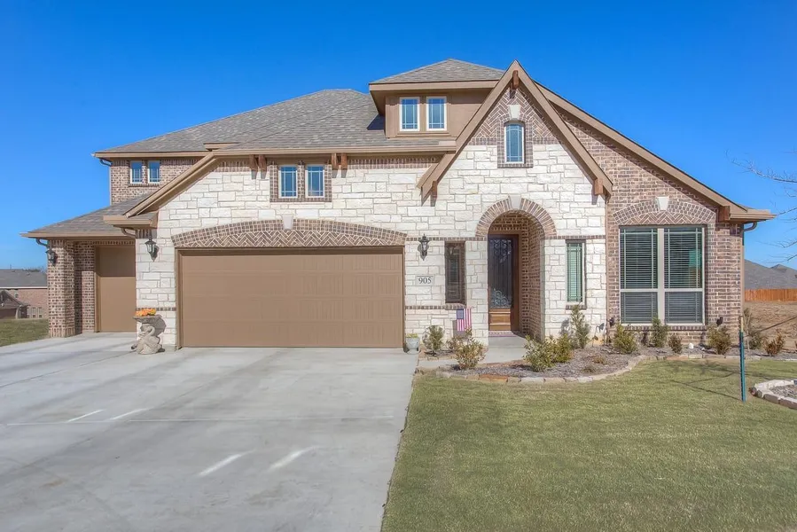 This beautiful 2017 Bloomfield four bedroom, 3 and one half bath home in Oak Valley sits on an oversized lot and contains numerous upgrades throughout. The wood-patterned tile floor in entry continues into the open living and kitchen areas, as well as all common areas downstairs, including the mudroom. The fireplace has floor-to-ceiling stone and a pair of French doors close off the study. The master bedroom-bathroom, as well as two additional bedrooms, round out the downstairs. Upstairs is the fourth bedroom with bath, media-game room, and an upstairs living area. The 2-car garage has extra length and the additional 1-car garage door is 8' tall. This house is fully guttered.