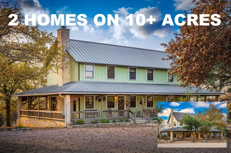 2 HOMES - TURN-KEY READY FOR STR, FAMILY COMPOUND OR RECREATIONAL RANCH ON 10.5 ACRES! Income producing properties located between Fredericksburg & Enchanted Rock just 9 miles N of Main St. Currently this unrestricted ranch & gorgeous venue is popular for both retreats & wedding parties w/potential for expansion. Enjoy the breath-taking spectacular sunset & exceptional views from the welcoming wrap-around porches while watching roaming wildlife, enhancing the rural peaceful atmosphere. House #1 is 3 bed 3.5 bath w/standing seam metal roof on 1 acre. House #2 is 3 bed 2 bath w/2022 new composition roof on .5 acre. Each sleeps 14 with open concept & high ceilings. Gazebo, stone patio, fire-pit, even a fenced dog run area for your four legged family members. Underground electric, detached double garages with electric door openers & 500 sf storage w/enclosed A/C workshop area. Well house w/w...