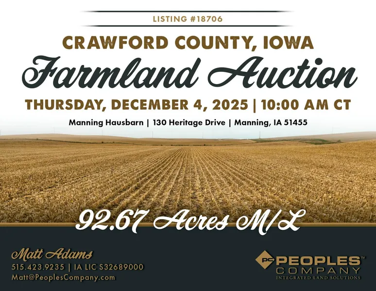 Crawford County, Iowa Farmland Auction - Mark your calendars for Thursday, December 4th, 2025! Peoples Company is pleased to be representing Hansen Bauernhofe LLC in the sale of their Crawford County farm located just north of Aspinwall, Iowa, and west of Manning, Iowa. The property consists of 92.67 acres m/l and is situated in Section 15 of Iowa Township, Crawford County, Iowa.