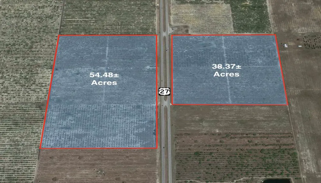 PROPERTY DESCRIPTION The opportunity is to purchase a 93 acre former citrus grove located on both sides Hwy. 27 in Lake Placid. 54.48 acres are on the west side and 38.73 acres are on the east side. A median cut allows direct access to the property. It has over 3,200 feet of frontage on Hwy. 27. The property also features 1-12" well that is permitted for 122,900 Avg. GPD, 569,900 Peak GPD, and 1,897,900 Max GPD. Soils consist primarily of Astatula and Paola.