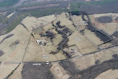 • Tract 1: Main farm tract with 54 acres, 1173' of road frontage and includes the main home, all the barns and out buildings, beautiful fenced pastures, several streams, and 1-1/2 acre pond behind the home.