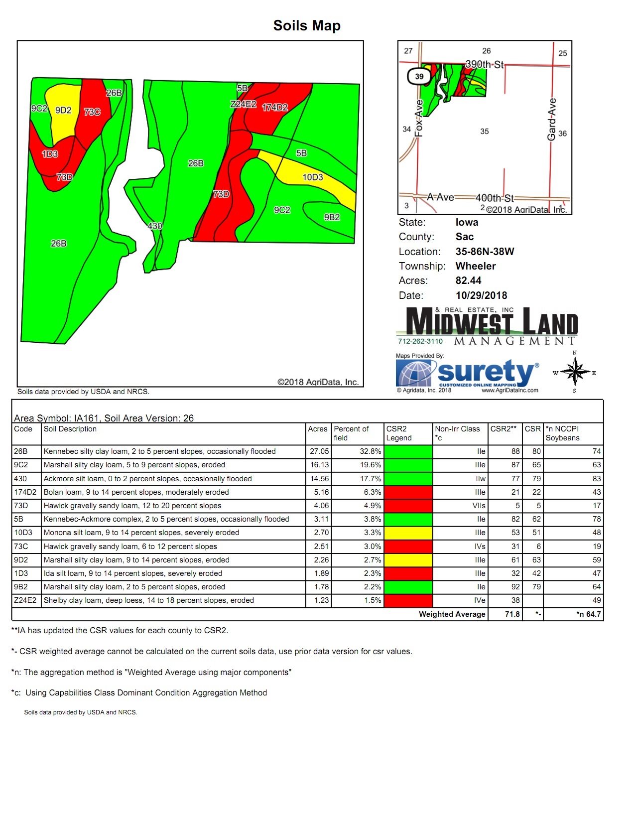 Average CSR2 is 71.8. Soils include Kennebec, Marshall, Ackmore, Bolan, Hawick, Kennebec-Ackmore, Monona & Ida