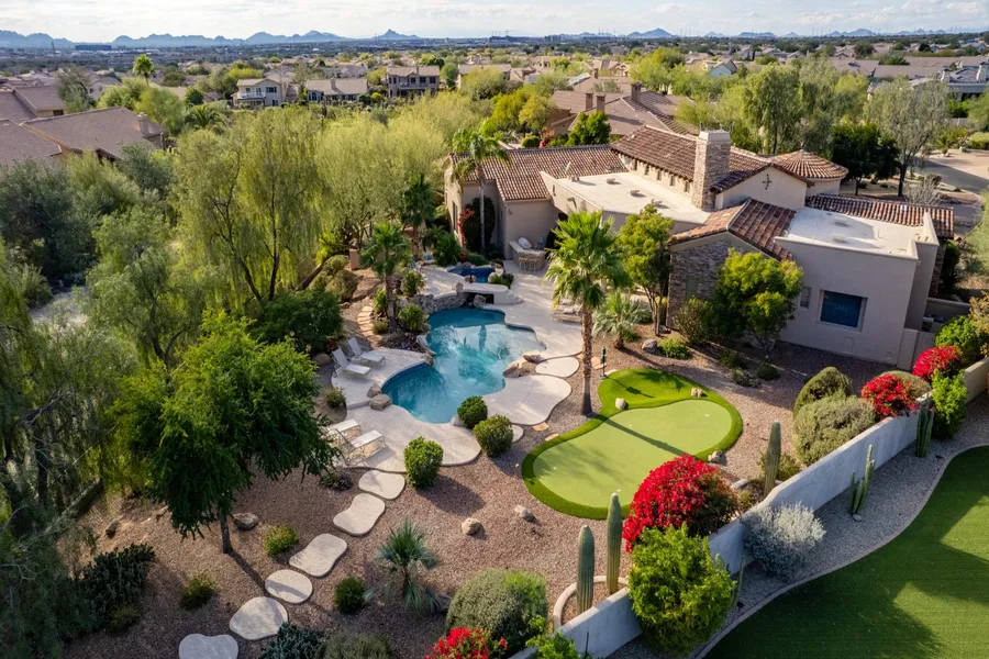 Seamless indoor-outdoor living defines the lifestyle, with living spaces opening to a resort-style backyard that feels like a private retreat. Outdoors, enjoy an expansive covered patio, multiple lounging and entertaining areas, a putting green, fire pit, and a sparkling pool and spaperfect for relaxed afternoons or elegant evenings under the desert sky. The oversized lot provides exceptional space and privacy, elevating the sense of resort living in the heart of North Scottsdale.