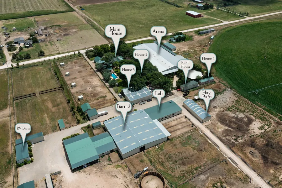 This property boasts a total of 103 covered stalls, an indoor arena, a stud collection barn with lab, both with air conditioning and heat. The 140x260 foot indoor arena is covered and includes screens and an office. There is a cow track and flag track with a large fan that will convey with the property. Additional amenities include a 80x40 shop with 15 foot overhead door, covered walker, an additional shop with 3 overhead doors and RV barn with heating and cooling. There are several sheds and hay barns on the property, the outside paddocks with sheds have water guns for irrigation.