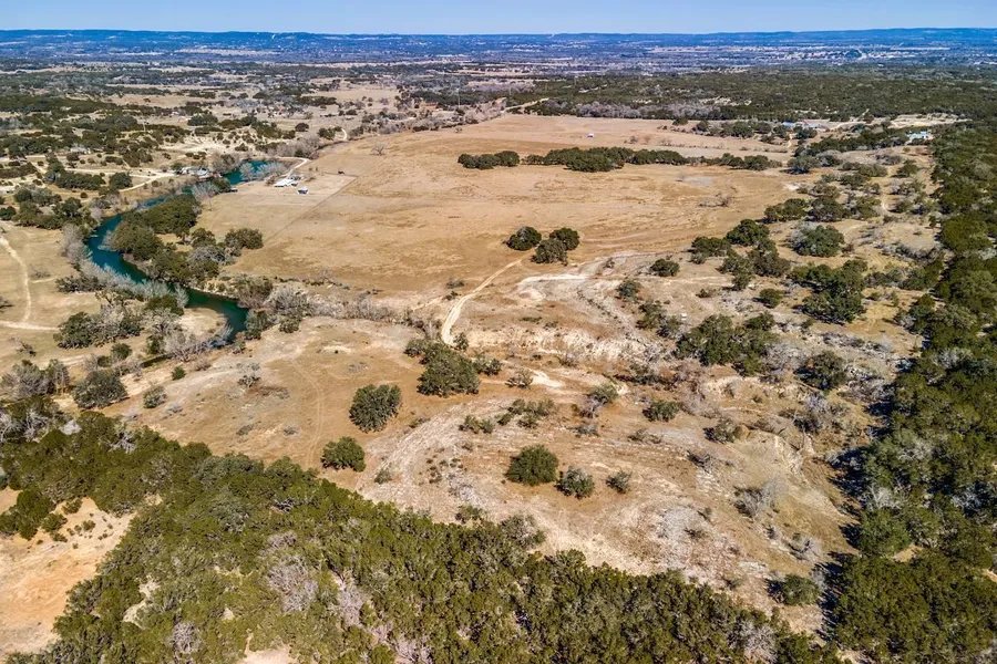 TERRAIN: The property is well positioned only 5 Miles west of Bandera close to all the amenities you need for your ranch. You enter the property from Paved FM 470 and drive down a gentle slope about a thousand feet to the beautiful constantly flowing Indian Creek of which you control both sides of. There are several younger cypress trees located on the creek and it is a great place to relax and enjoy the flowing water. As you drive over the damn you come upon some beautiful pastureland that would be great for riding and grazing several horses or for putting into production if so desired. In the middle of the property as you meander through there is a beautiful run of mature Oak trees that goes all the way to the back of the property creating a nice natural division between the N/E and S/W part of the property. As you traverse to the to the back of the property on the S/E the terrain begins to rise going from 1380` all the way up to 1460` at the highest point. There are several well established trails that run to the higher points of the property and the terrain provides for some amazing views of the area. On the S/W side of the property there is a dramatic draw that is part of the property and it`s a great place to explore and the wildlife love to travel through this region down to the creek. Throughout the property there are great build sites, and it will be up to the new owner to determine the best spot for their desires. Fun Fact there were a few famous actors that liked to hang out and play polo on this property and one of John Wayne`s co actors is buried on the property.