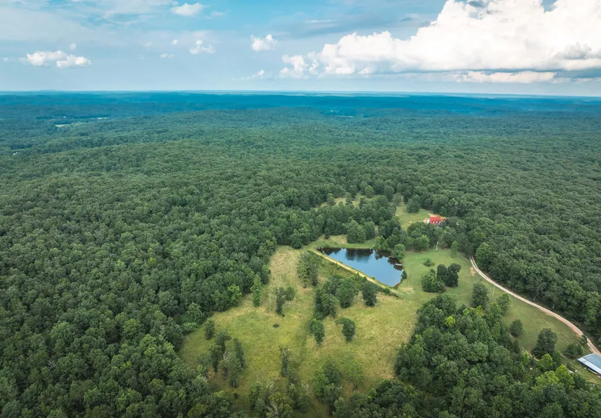 Wonderful opportunity to enjoy a rural lifestyle on 176+/-, mostly wooded, acres that includes a cabin, stocked pond, 30 x 40 steel building (w/ 10 x 40 lean to), and 2300 sq ft custom home. The 4 bed/ 4 bath, 2.5 story home features a large covered front porch w/ an 18' gazebo, main floor primary bedroom, custom cabinetry & woodwork, 9' ceilings, as well as hardwood floors. There is a large bonus room above the second floor for additional living space and the walkout basement has an additional kitchen area. The metal roof on the home has a 50 year warranty and can withstand up to 125 mph winds. 20 x 24 log cabin equipped with electric, septic, and water. A great trail system exists through the farm and allows for easy access to numerous stand locations. There is apprx. 15 acres cleared and planted in pasture grass if an area is needed for livestock. The location is nearby Mark Twain National Forest and Corps of Engineers lakes.