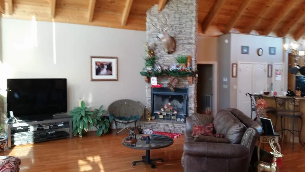 The home is brick exterior with lodge like construction inside. On the main floor there is a splt floorplan with a huge master suite at one end, two bedrooms and a bath at the other and a large open living/dining/kitchen area in the center. Both the living/kitchen area and the master suite have open timber-frame ceilings. There is a beautiful view of the farm through the chalet-like windows facing out the back of the home. There is also a large deck accessed from the living area that extends the area of the home that can be used for entertaining. The finely app...