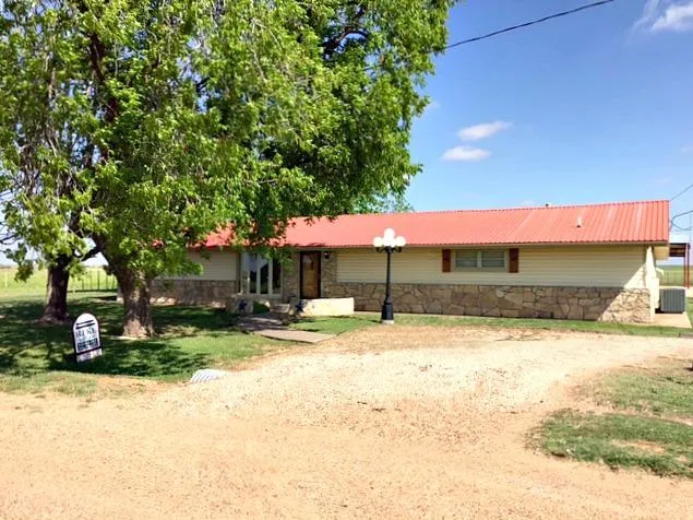 This impressive natural stone residence provides the perfect location for privacy and enjoyment. Located next to a tree lined drive this three bedroom three bathroom property offers large kitchen with built in appliances, open pantry and breakfast bar. The dining and living room are airy with beautiful views of northern Haskell. The home also offers a second living area or den, metal roof, newer central heating and cooling and multiple parking areas. Outside you will find two water wells, a large barn with concrete floor, electricity and tack room, covered patio, multiple stall areas and corals. The home is located on 20 lush acres of wheat ground behind substantial fencing. This property wont last long due to its location and amenities.