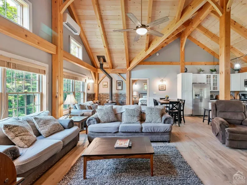 Discover the epitome of rustic elegance in this custom-built Timber Frame home, crafted with meticulous attention to detail by the Vermont Frame Company. This residence showcases the timeless beauty and durability of exposed post and beam construction, featuring mortise and tenon joints. Spanning 1450 square feet with an additional 1350 square feet on the lower level that could easily double the living space, this home boasts 2 luxurious en-suite bedrooms with tiled baths. The open concept layout, highlighted by vaulted timber ceilings, creates an inviting atmosphere that blends the living, dining, and kitchen areas seamlessly. The chef's kitchen, equipped with a large farm sink, custom cabinets, and two granite islands, is perfect for both meal prep and hosting. Enjoy cozy evenings by the woodstove, with mini splits for efficient heating and cooling and radiant heat in the floors ensuring comfort year-round.A laundry room with ample storage and a utility sink adds to the practical amenities. The fenced backyard provides a secure space for pets, while the full basement offers workshop space, room for car, toys and tools or potential for additional living area. Enjoy far reaching mountain views from the front covered porch and the convenience of being near Windham Mt Club and Main Street's shops, restaurants, and outdoor activities.Built in 2020 and maintained with care, this home promises modern comfort and lasting value. Experience the perfect blend of timber frame charm and contemporary living in this quintessential country home.