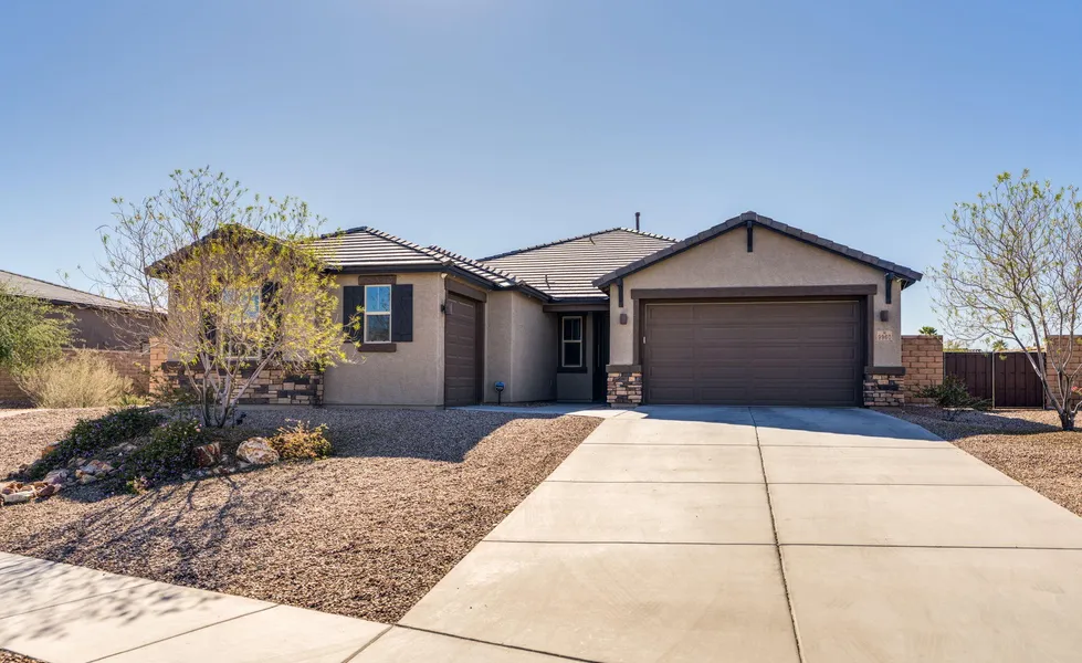 Built in 2022 and thoughtfully upgraded WELL BEYOND builder standards, this exceptional 4/3 PLUS dedicated den offers 2,517 sq ft of modern living on a generous .28-acre prem lot on the east side! 3 car split garage with the 3rd being a gym/rock climbing bay! Upgrades include: satin granite countertops, soft-close cabinetry, water softener, reverse osmosis system, a Murphy bed in the 4th bedroom, solar panels, stackable sliding patio door, extended primary shower, the list goes on. Resort-style backyard that truly sets this home apart. Custom pool, travertine tile, turf, planted citrus trees, fire feature and a fully equipped outdoor kitchen with a 42'' gas-connected grill and ramada. Upgraded outdoor lighting and built-in speakers create the perfect ambiance for evenings under the stars!