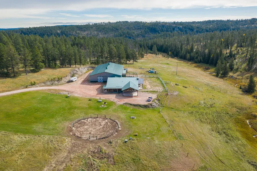 A BEAUTIFUL PLACE TO HANG YOUR HEART! One of a kind - take your breath away - property. Stunning brand-new home inside with beautiful high-end finishes throughout. Everything one could dream of in a Black Hills retreat 4 bdr/4 bath home (including an upstairs apartment) plus attached indoor riding arena and horse stalls. Perfectly set on 163 acres of high beautiful rolling land with amazing views! Completely surrounded by USFS lands, Nichols Creek runs from one end to the other, and just of a mile from black top road and Deerfield Lake with all its fishing/kayaking/recreation. Plus adjacent to snowmobile trail #9 (350+ miles of trails). New round pen, too. BRING YOUR HORSES or recreational vehicles for the rides of a lifetime exploring all the miles of beautiful USFS lands in this most coveted area of the Beautiful Black Hills!