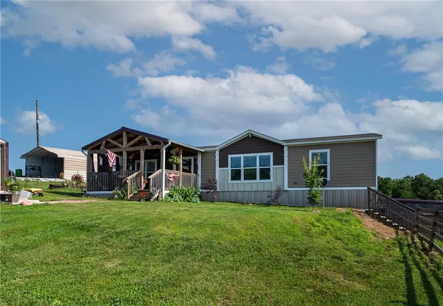 Own your piece of paradise. Bring your cattle, horses and buffalo. As you drive through the gate and head up the hill you will be amazed at the view. Sitting on the top is a beautiful 2018 manufactured home with a welcoming covered porch for your evening relaxation. The home features, 3 bedrooms, 2 bath, a split floor plan, lovely finishes throughout and it is on a permanent foundation. If you follow the wood walk way it will lead you to where you will want to entertain your guests. You will find a hot tub with a canopy, a smoker, a grill and a fire pit that conveys. There is a block underground room with a walk out on the east side of the house for a hangout or storage. There are two-2 car -full carports, other various outbuildings, and a pond all sitting on 18 acres m/l. There is Deer hunting on the property and fish in the pond for the sports enthusiast.