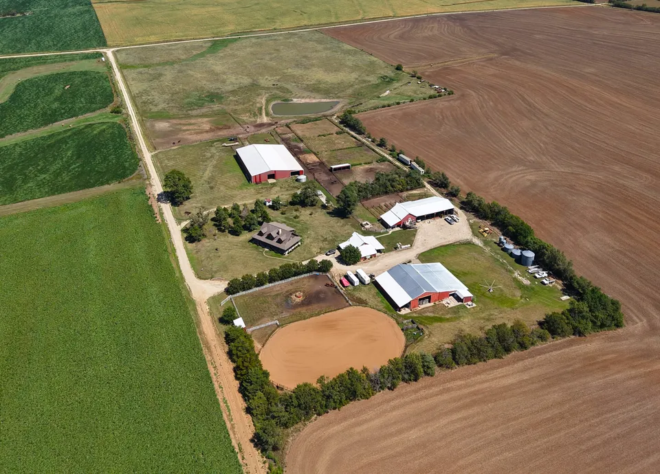 Whether you're a horse trainer, breeder, or enthusiast, this property is worth a serious look. With approximately 32 acres, this ranch has something for everyone. Continuous panel fencing spans the property and is ready for livestock. With both indoor and outdoor arenas, you can ride year-round, rain or shine. The north half features a 23-acre pasture with a pond, offering room for your operation to expand. Conveniently located on gravel road frontage off 3300 Avenue, this secluded property is easy to access. Enjoy breathtaking sunsets and incoming storms from the home's wraparound porch. The 3,000-square-foot home has been thoughtfully updated, including a custom fireplace. An unfinished basement provides room for the new owner to customize. The entertainment room and bar make hosting guests easy and fun. The bunkhouse offers additional income potential or a place for visiting family. The property operates on rural water and propane heat, providing comfort throughout the winter. This ranch offers endless possibilities—don't miss your chance to make it yours!