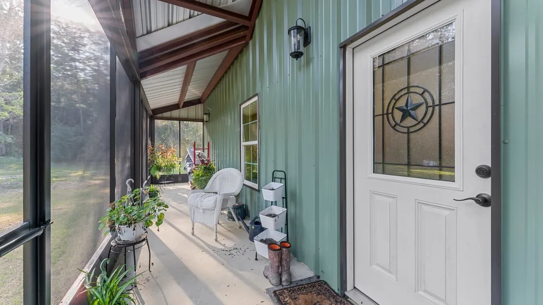 Beautiful barndominium on 14 acres that have been recently under-brushed! Open concept with sealed concrete floors, barn doors & 9' ceilings. Spacious living area with soaring ceilings. Kitchen features large island, breakfast bar, farmhouse sink, granite counters & custom shaker cabinets. Split floor plan with private primary suite, French doors, dual vanities, huge 9.5' x 5' walk-in shower & large walk-in closet. Second bedroom near hall bath with clawfoot soaking tub. Third room used as canning room with cabinets & farmhouse sink—easily converted to 3rd bedroom. Tankless water heater, spray foam insulation; including walls and attic, fully decked attic for storage. Enjoy screened-in front (53’ x 6’) & back porches (53’ x 10’). Two 12x20 storage buildings with electricity & trailer hookups. 24k whole-house generator & 500-gal propane tank. Peaceful country setting with modern comforts! Located only 15 miles from Sam Rayburn and 22 miles from Lufkin. Under Appraisal Dis. Value.