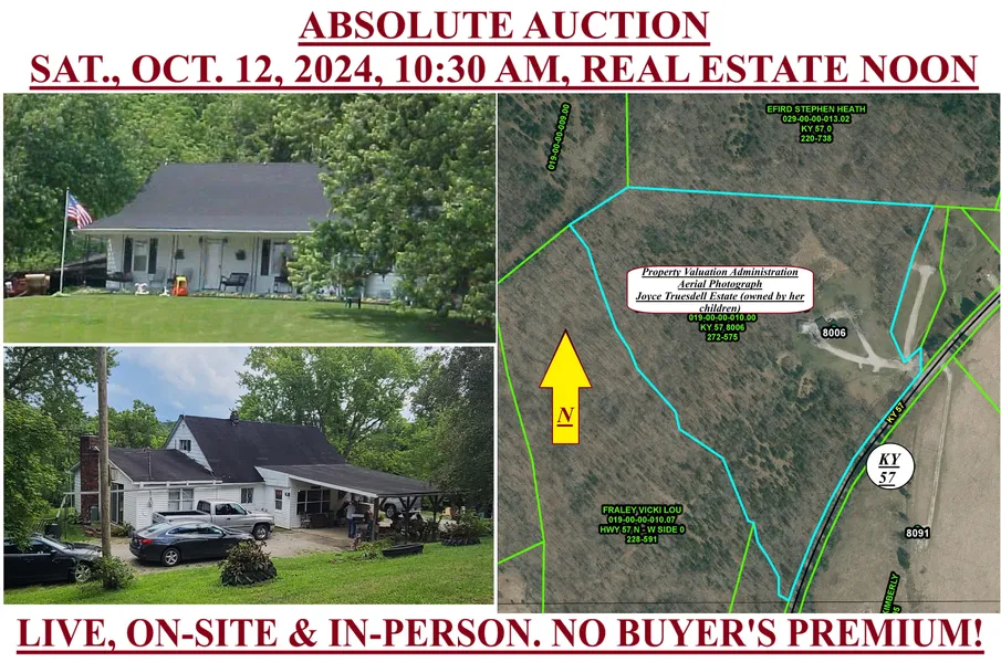 TERMS OF PURCHASE, REAL ESTATE: Property sold at Absolute Public Auction (meaning that the real estate will be sold for the maximum bid made with no reserves or minimum prices established. The definition of Absolute Auction as defined by the Kentucky Board of Auctioneers has been provided to the Sellers and auction will be conducted in compliance with said definition) as a live, in-person, on-site event. No online bidding provided, although absentee bids are conditionally accepted. In the event that absentee bids are made, absentee bids shall be made on the absentee bidder's behalf in a competitive nature and not necessarily the absentee bidder's highest bid/offer., as a cash sale with no contingencies with regards to financing or inspections, with the purchaser to place a non-refundable deposit equal to 10% of the purchase price down on date of sale with balance due in full within 30 days of auction (on or before the 12th day of November, 2024). Terms of purchase are Cash to Seller: NO CONTINGENCIES OF ANY KIND PERMITTED. Possession with deed at closing. Sellers to maintain insurance on property though date of closing (including liability; agent/auctioneer is not responsible for accidents); however successful purchaser will have an inherent and thus an insurable interest in the property as of date of sale and is encouraged to obtain insurance immediately upon sale as purchaser will assume risk of loss from under-insurance, lack of insurance, or in the event of fire or other disaster. The home on the property was constructed prior to 1978, thus Lead-Based Paint could potentially be in evidence. Purchasers concerned about the possible presence of lead-based paint are encouraged to arrange and conduct --- at the prospective purchasers sole expense --- any inspections for the presence of Lead-Based Paint they so desire prior to purchase, as purchaser will be required to waive the rights to any contingency relative to any future testing or presence of Lead-Based Paint as a condition of purchase. Year 2024 real estate