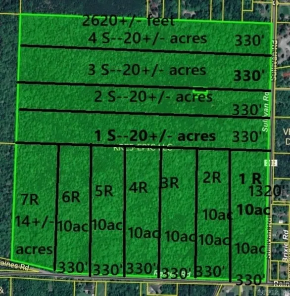 Property has 154+/- acres in Pulaski County, Arkansas. There is a platted Sub-division dated 1916 covering the property. The Seller is abandoning the old sub-division and breaking the property into 4 20-acre tracts, 6 10-acre tracts, and 1 14+/- acre tract. The 20-acre tracts are on Sullivan Road, have 330 ft of frontage, are priced at $400,000. The 10-acre tracts and the 14+/- acre tract are on Raines Road and are priced at $250,000 and $350,000+/- respectively. When the first tract sells, the Seller will immediately petition the County of Pulaski to abandon the old sub- division and when this is approved, a survey will be conducted to break up the entire parcel into the mentioned tracts. Buyers will receive a metes and bounds survey for their respective tracts. All offers will be contingent on getting the old sub-division abandoned and getting the final survey.