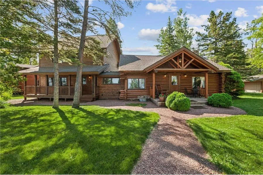 Luxury log cabin estate nestled above 267 feet of pristine shoreline, this stunning Swedish-style log home with a 2013 addition blends craftsmanship, comfort, and breathtaking views. Just five minutes from Ashland, it’s ideal as a year-round residence or private lakeside retreat. The main home features a luxurious owner's suite, soaring pine ceilings, cedar and oak finishes, and a great room with a floor-to-ceiling stone fireplace. The second level offers cathedral ceilings, a cozy wood stove, and a balcony with sweeping lake views.
