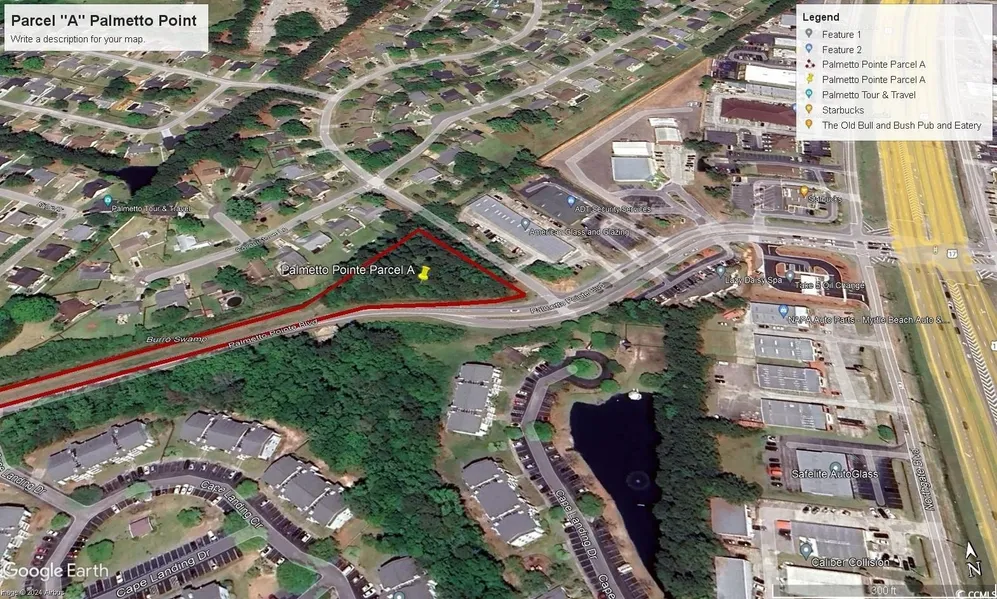 Palmetto Point Blvd. road was extended to Highway 544 and the big block area. Traffic Count is 9,500 along Palmetto Point Blvd (2023). Just down from Market Common. About a 100 yards from Highway Bypass 17 and a couple miles from SayeBrooke Shopping Center (Target, Pet Smart, Marshall's, etc). It is zoned as Office, Professional and Institution. Great corner acreage in b/n two roads which heads to several developments (Stone Bridge). Great visibility to all traffic along Palmetto Pointe Blvd. Starbucks just around the corner along with Caliber Collision, Safelite Autoglass, The Old Bull and Bush pub eatery, etc.