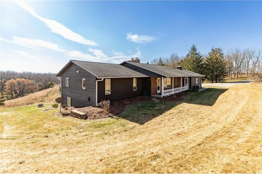 Picturesque setting on 5 acres just 15 minutes from Rochester. Walk out ranch style home sits on hillside with panoramic views in every direction from your huge maintenance free Trex deck with Westbury deck railings. This beautiful home features main floor master suite with ensuite, double see through fireplace connects the living room and kitchen dining room area, plus spacious laundry/mud room area. Open staircase to lower level has solid oak treads & stringers and features 2 bedrooms, 2 full bathrooms, family room with cozy fireplace, office area and lots of storage. Newer mechanicals include boiler with on demand heating baseboard, water heater, and A/C. 50x54 shed complete with concrete floor, water hydrant and is completely wired. 45x75 garden with 6 foot high fence is a gardeners paradise. Take a tour today.