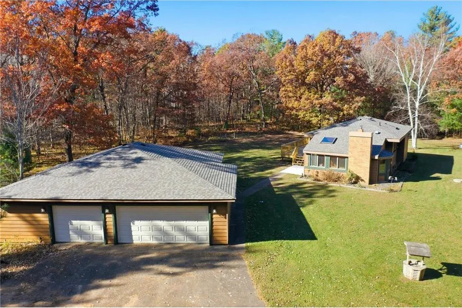 Darling 2 bedroom year round home or cabin. Tucked away on a private 9.93 acre setting surrounded by deer & wildlife. Awesome 25x40 garage with an attached 16x34 rec/bonus room that's perfect for entertaining, guest overflow, workshop or office. New 29x12 deck, concrete patio, entry doors, patio door & shed doors, new roof, stainless kitchen appliances, carpet & gas forced air furnace. Stay warm and comfy in the spacious 12x21 family room with a cozy wood burning fireplace. Great location near multiple lakes, trails & the Clam River. Make this beautiful, peaceful, paradise your own!