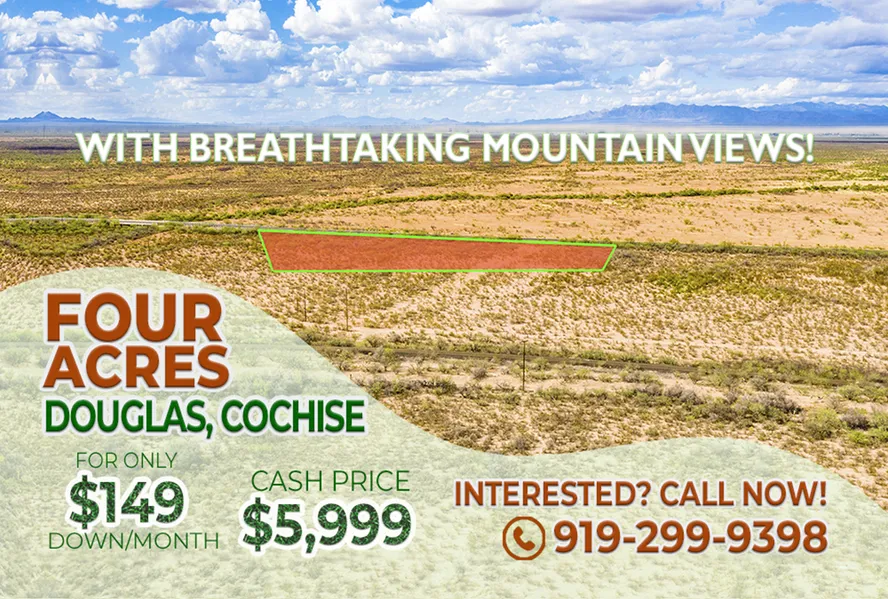 Secure these affordable FOUR Acres or the 3 adjoined FOUR ACRES of raw land in Douglas, Cochise NOW. These are the ideal lots for a great investment, for your retirement, or a vacation home-site with huge potential for making a dream come true. Enjoy and relax while the land value appreciates.