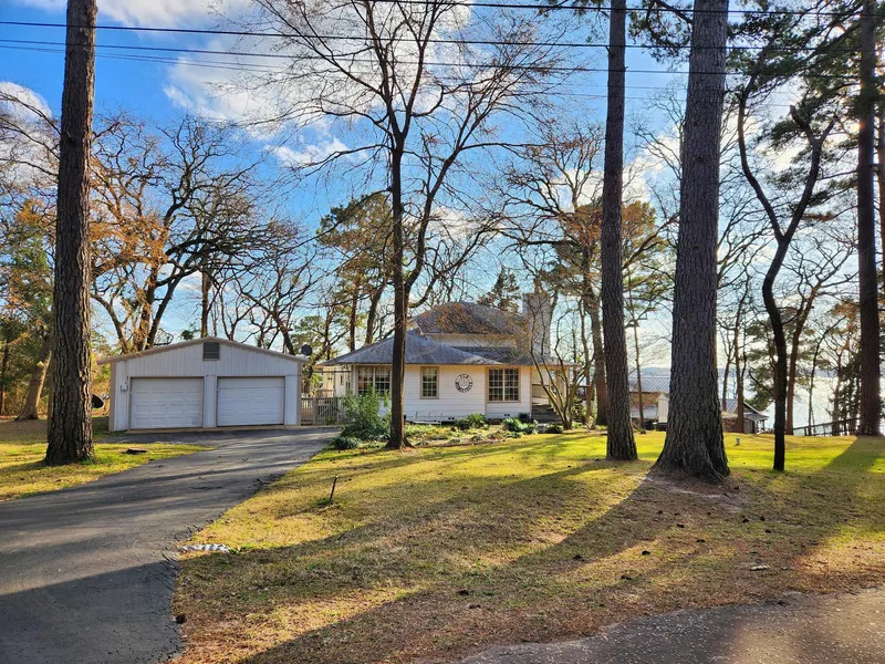 Exceptional Lake Palestine Retreat with Breathtaking Views! Nestled among towering trees on three hilltop lots, this incredible property offers unparalleled views of Lake Palestine. Climb the blue stone steps to the covered front porch of the main house and linger awhile to absorb the natural beauty that surrounds you. The gracious entry hall opens to a spacious living and dining area, where a brick fireplace and a grand picture window frame the sparkling lake beyond. The main house has 2338 sq. ft. with two bedrooms & 2.5 baths on main level, and one bedroom, 1 bath located on second floor. An office (or sunroom), surrounded by walls of windows, creates an inspiring workspace with serene lake views, while a large utility room at back of home provides multiple options for use. Outside, the spacious bi-level elevated deck overlooking the lake is a tranquil havenideal for morning coffee, sunset gatherings, or simply soaking in the gentle breeze through the trees. The detached two-car garage includes a 529 sq. ft. cozy apartment complete with an open bedroom, living space, kitchenette, and bathroomoffering privacy and comfort for guests. Surrounded by nature, this lakeview gem is a perfect getaway or full-time retreat. Dont miss this rare opportunity to own a slice of paradise on Lake Palestine!