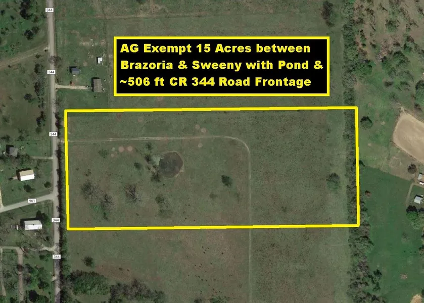 AG Exempt & Owner Financing Available! 15 Acres by Brazoria & Sweeny with ~506 ft CR 344 Road Frontage, Pond & Nice Views of the San Bernard River. Property is cleared with some good tree coverage. Tract is not located in any city limits or Extraterritorial Jurisdiction (ETJ). No Known Deed Restrictions or Zoning Laws. San Bernard River Area is home to many vacation/2nd Homes for Houston Area Residents & is considered one of the "Best Kept Secrets" in Texas. Projected Plant Construction in the Area for Dow Chemical, Freeport LNG, Chevron Phillips Chemical, Phillips 66 & BASF are part of over $10 Billion in current projects underway for Lake Jackson/Angleton/Freeport area. Enjoy boating, fishing & skiing on the River that empties into the Intercoastal Waterway. Cattle on Property. Additional 22.9 acres available for Total of 37.9 Acres with San Bernard River Frontage, 528 sqft a/c cabin w/attached 1-car garage, screened pavilion, 2 barns, Gazebo, 2 water wells & 1 septic system (see Pics).