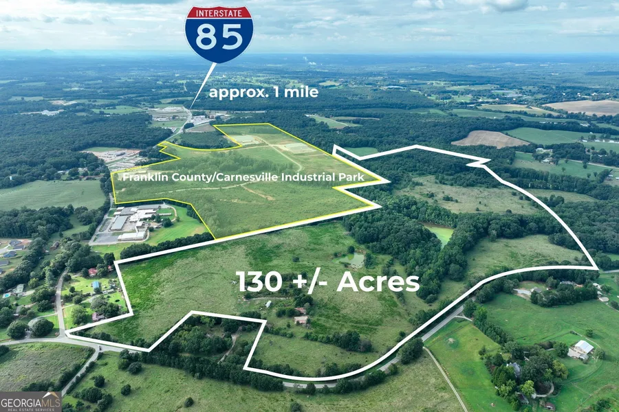 Two tracts - one tract apporox 130 Acres plus one tract approx 15 - TOTAL ACRES = approximately 145 acres of beautiful land, are situated in Franklin County, adjacent to the Franklin County Industrial Park at I-85 exit 166 in Carnesville. This expansive agricultural tract can be incorporated into the Industrial Park (with final approval required), providing access to all necessary utilities for industrial purposes. The property is offered as two parcels sold together. A preliminary title boundary survey is available. The property boasts ample road frontage and natural beauty, featuring gently rolling terrain and substantial potential. The house on an approximate one acre section (2556 Turkey Creek Rd.) is not conveyed with the current offering but may be available for purchase separately. This location is truly outstanding.