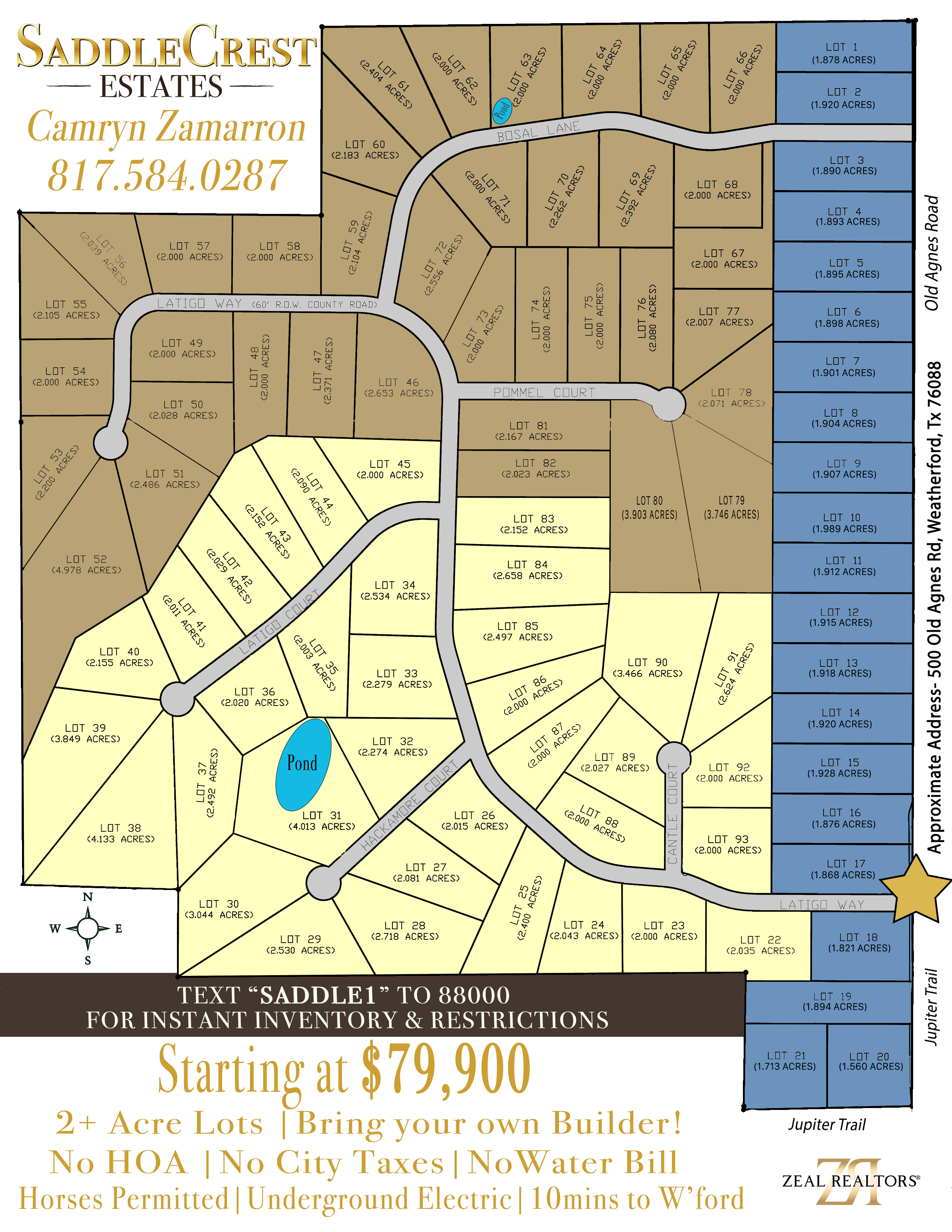 This beautiful 2+ acre property features treed acreage & open spaces allowing for many options. Bring your own builder to build your dream home, just minutes north of the downtown square. Guest house or second mother-in-law home allowed for multi- generational living. Horses, cattle & small farm animals allowed. Be one of the first to claim your ground in this new addition, surrounded by various tracts ranging from 2 to 4+ Acres. Restricted to protect your investment, yet relaxed giving you freedom on your own land. Txt keyword "SADDLE1" to 88000 for current inventory & schedule your land tour!