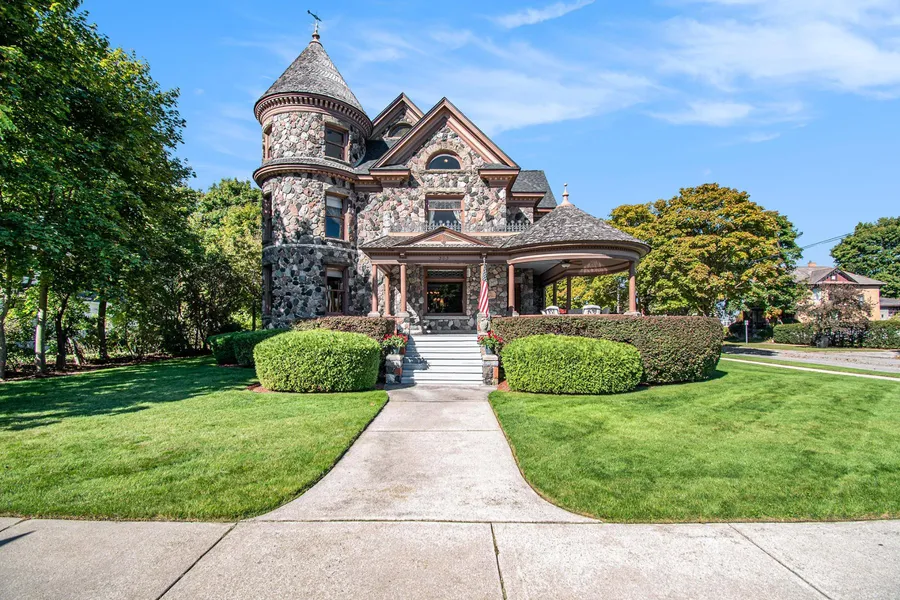 THE CASTLE, like no other! Fully Furnished. Extraordinary with unsurpassed artistry, prime location within the City of Alpena, Michigan with gorgeous Lake Huron views. The Castle embodies timeless architecture with the preservation design for present day lifestyles. Enjoy a piece of history with this restored stunning Victorian stone home, featuring ornate woodwork, leaded glass windows, a wraparound porch and gorgeous Lake Huron views. The perfect place for summer barbeques or cozy winter nights with friends and family. The home was originally built for Charles Henry, a Michigan State Senator in 1902. The original design was based on architect H. H. Richardson’s Victorian Romanesque style. The interior design was done by Marshall Fields of Chicago, Illinois, who commissioned an artist from New York to paint oil on canvas murals on all the dining room walls. This property is being sold Turnkey with hand carved solid wood furniture, artwork, area rugs, and lamps included in sale. Convenient to this location is the municipal owned waterfront boat harbor across the street featuring rental boat slips, as well as tennis courts, park, band shell, and public beach. Alpena is also home to the Thunder Bay National Marine Sanctuary and Underwater Preserve consists of 4,300 square miles. FEATURES: Upon entering the home, you will note the exquisite hardwood flooring throughout and leaded glass accent windows. The magnificent hand carved stairwell and cornices show the craftsmanship of that period. There are three unique fireplaces; in the foyer sitting room, the library, and the dining room. The open flow of the great room offers an additional window turret area, original Waterford crystal chandelier and large entertaining space with three large pocket doors that can be closed to accommodate a variety of needs. The library with stunning carved partner desk is ideal for work from home. The dining room is off the foyer with a beautiful hand painted oil on canvas wall mural. The kitchen is designed for contemporary living with newer cabinetry and stainless appliances. There is a breakfast area in the kitchen overlooking the elevated patio for casual outdoor dining. Completely renovated first floor powder room. Second level offers five spacious well-appointed bedrooms which include all currently staged bedding. The Primary bathroom suite with full bath has been updated. Third level is a former ballroom/bonus room with plenty of extra space for entertaining and sleeping. The three floors offer 7443 approximate square footage. This magnificent Residential property is also Alpena City zoned as a Bed and Breakfast.