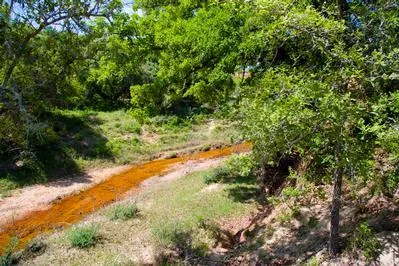 Sandy soils are predominant, mostly with a tan to red tint. Highly unusual subsoil layers are observed on the cut bank of the creek, reminiscent of the Arizona desert, with carved sandstone hues of orange, yellow and maroon. Deep, narrow gorges have been eroded by centuries of surface water flow into Alum Creek, and these features are regarded as highly unusual for this area. The Alum Creek streambed is sandy with intermittent rocky shoals. A geologist or rockhound will enjoy this ranch immensely!