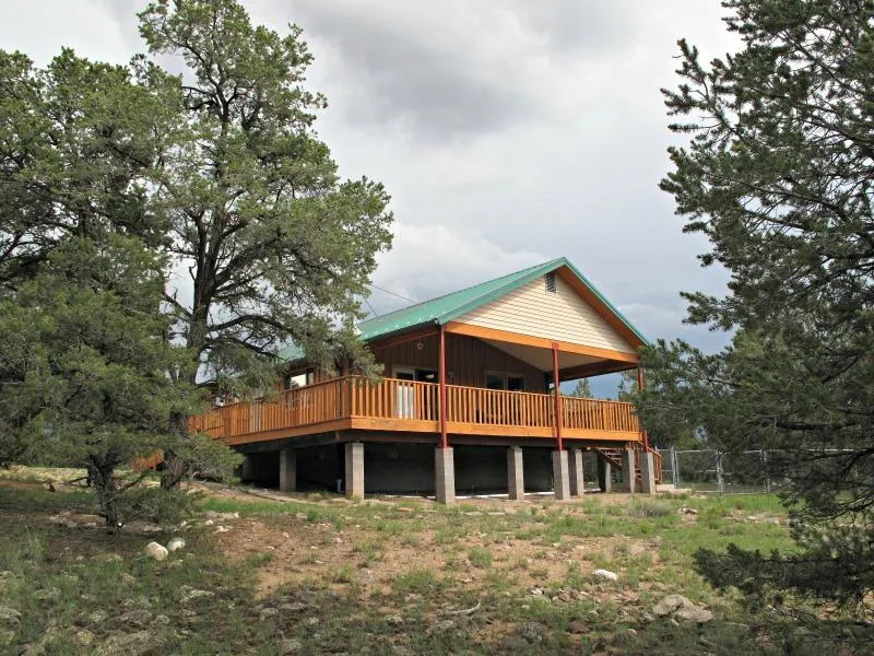Located approximately 10 miles NE of Quemado, NM in the Starfire Ranch Subdivision. Amangani translates to Peaceful Home which adequately describes the 1,008 sq. ft. site built cabin that encompasses 15.27 acres of scenic views that overlook heavily timbered land. The home was built in 2005 and has metal roofing that covers the majority of 500 sq. ft of all weather Trex decking. The interior includes a great room with a vaulted ceiling, tongue in groove pine walls and ceiling, and pine cabinets in the spacious kitchen/dining and living area. There is a large master bedroom and one full bathroom with shower and tub. Flooring is laminate and tile. The huge laundry room has a sink, washer/dryer hookup and tankless water heater that leads outdoors to two chain link dog areas. Water is supplied to the home by a productive well and a underground pressure tank. The utilities are also undergr...