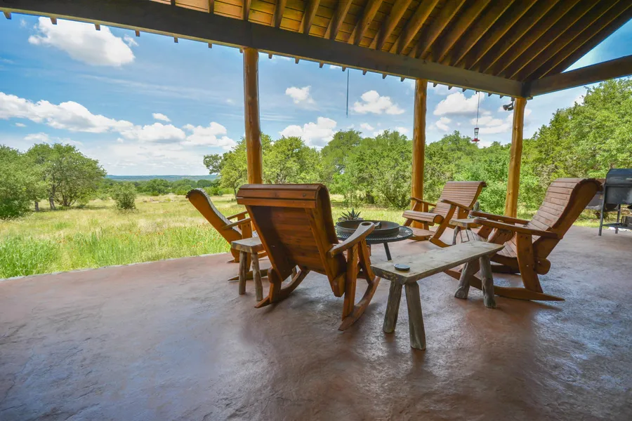 This Hill Country property is both peaceful and private, offering the best of the Texas Hill Country with expansive views, mature trees, and wildflowers. The main home is tucked away to enhance views and privacy. Built with fine craftsmanship, there are a wealth of great touches throughout. The floors are Australian Cypress, and the ceilings are knotty pine. The whole structure has an organic feel, with windows looking out to trees and Hill Country in every room, and each one having nice touches of wood or stone. The gourmet kitchen has a breakfast bar, and quartz stone counters that open up to main living. Alder wood cabinetry compliments the kitchen.