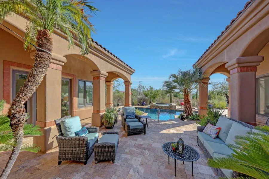 This stunning home in the exclusive guard gated Ancala community is luxurious living at the base of the McDowell Mountains. Updated landscape on a private and large lot offers a wonderful space for entertaining. Inside, this Hacienda style floor plan includes a chef's kitchen equipped with a Wolf cooktop, Sub Zero fridge, Bosch dishwasher, and warming drawer. A 2-way fireplace enhances both the formal dining room and den. All four bedrooms are ensuite, ensuring privacy and comfort for all. The spacious primary suite boasts a fireplace connecting to the adjacent seating area, newer Anderson windows and French doors that open to the patio, complimented by a remodeled bath featuring an Aquatic Whirlpool jetted tub and custom His and Hers closets. Nothing compares, so come take a look today!