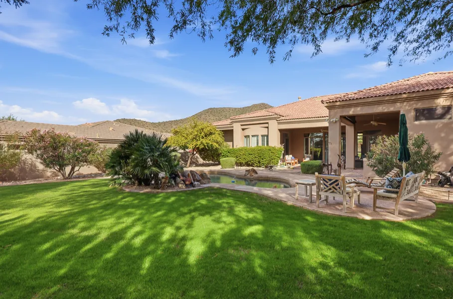 Experience stunning MOUNTAIN VIEWS from your spacious, serene backyard in the guard-gated Ancala community. This beautifully remodeled 5 BD | 4 BA with a desirable split layout is framed by scenic mountain views. This is an EXTREMELY private home with a large area of undisturbed land adjacent to the home for added privacy, rare for Ancala! The light-filled foyer with newly refinished travertine flooring opens to formal living and dining spaces highlighted by glass doors, a gas fireplace, coffered ceilings, and rich hickory wood flooring. The open floorplan gourmet kitchen connects seamlessly to the family room and is equipped with chiseled granite countertops, eat-in kitchen, center island with bar top seating, walk-in pantry, 5-burner gas cooktop, and double ovens, all for effortless entertaining. The family room features a custom entertainment center and fireplace, wood beamed ceilings, updated wood flooring, recessed lighting, and direct access to the backyard oasis. Outdoor living is highlighted by a heated, app-controlled pool and spa with a dramatic rock waterfall, built-in BBQ, lush landscaping, and a large grassy yard supported by automatic landscape timers ideal for pets, play, and relaxation. The large primary suite features plantation shutters, and a spa-like retreat with dual vanities, large walk-in shower with floor-to-ceiling surround, a soaking tub, and large walk-in closet. All guest bathrooms have also been tastefully remodeled, with notable highlights like an en-suite bedroom and an additional Jack & Jill en-suite. Additional upgrades include a 3-car air-conditioned garage with NEW epoxy flooring and storage closets, updated exterior paint (2022), patio roof (2022), and newer AC units (2020 & 2022). Make this rare opportunity yours and own a private, upgraded home with mountain views in the exclusive Ancala country club community, offering resort-style amenities including golf, sports courts, a community pool and spa, a children's playground, and more.