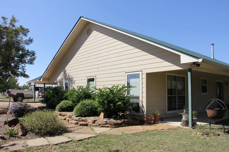 The energy efficient 2,000 sq ft ranch home sits on an elevated area overlooking the creek. It features relaxing front and back covered porches that provide a great outdoor environment setting. The home is on a concrete slab and was built in 2011. The 2 bedroom 2 bath home is in excellent condition and ready to move into. The living room has a vaulted ceiling and a cozy Dutch West free standing wood burning stove.