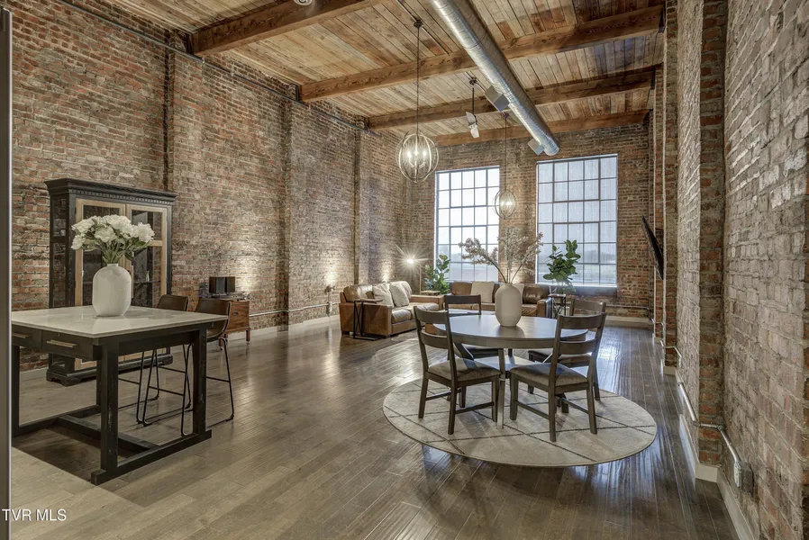 Looking for a fully furnished, luxury loft in Downtown Bristol? The Victor, where historic craftsmanship meets modern elegance in the heart of State Street, Bristol, Virginia. Perched on the third floor overlooking State Street, this beautiful executive two-bedroom, two-bathroom apartment offers sweeping views of both the historic downtown and the distant Holston Mountain range. Located on the vibrant and up-and-coming 800 Block of State Street, The Victor is surrounded by Bristol's most popular destinations, including Cascade Draft House, The Sessions Hotel, Delta Blues BBQ, and the Farmers Market - all within steps of your front door. Completed in 2020, The Victor is a Certified Historic Restoration recognized by both the National Park Service and the Virginia Department of Historic Resources (VDHR), blending authentic warehouse character with contemporary sophistication. Inside Unit 302, you'll find soaring 12-16' ceilings with original 13'' hemlock beams and heart pine tongue-and-groove ceilings, creating a dramatic and open living space. Restored rolled-steel windows with new laminated clear glass flood the loft with natural light and frame stunning views of downtown and the mountains beyond. The gourmet kitchen features custom wood cabinetry, floating shelving, and rare White Macaubas quartzite countertops. Outfitted with LG stainless steel appliances, including a counter-depth refrigerator and whisper-quiet dishwasher, the kitchen combines functional design with elegant finishes. It is fully stocked with everything needed for short- or long-term stays, including plates, cups, cookware, utensils, coffee makers, and knives. The apartment is furnished with new solid wood bedroom furniture, flat-screen TVs, and tan Italian leather sofas in the living room - creating a warm, sophisticated, and inviting atmosphere that complements the building's architectural heritage. The master suite offers generous space, abundant natural light, and a serene setting for rest. Its spa-inspired bathroom includes a 3x5 glass walk-in shower, double marble-topped vanities, and a private toilet room. The second bedroom and bathroom continue the thoughtful design with subway tile walls and Aztec black floors. Additional highlights include: - Carrier heating and cooling system with Wi-Fi thermostat - Maytag washer and dryer in-unit - Fire sprinkler and alarm system throughout - Public rear parking lot access With panoramic views, historic authenticity, and refined finishes, Unit 302 at The Victor Rent includes all utilities.