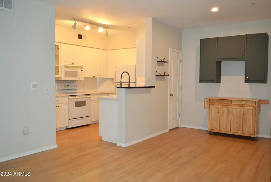 Upgraded, split bedroom floor plan within gated community offering resort style living. Each bedroom has an attached full bath and walk-in closet. Fantastic amenities include: 3 pools with one heated in the wintertime, 24 hr bi-level fitness center, on-site security, heated spa, media lounge, conference room, business center and more. This beautiful condo has Quartz countertops with under mount sinks, R/O system with easy touch filter change, porcelain tile backsplash, laminate flooring, 9ft ceilings, contemporary white cabinets w/glass doors, front load washer/dryer. Water, sewer, trash, gas and one assigned parking included in rent. Open parking is available on top of gated garage. Just minutes to Sky Arbor, Biltmore Fashion Park, Business District & Downtown Phoenix.