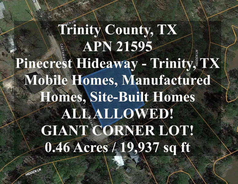 Large lot at the corner of Castaway Ln and Hidden Ln in Pinecrest Subdivision. Pinecrest is a waterfront community on the Trinity River that flows into beautiful Lake Livingston. It has relaxed deed restrictions to keep the area nice but give residents the freedom they want. Community has a private fishing pier (with great fishing!), boa...