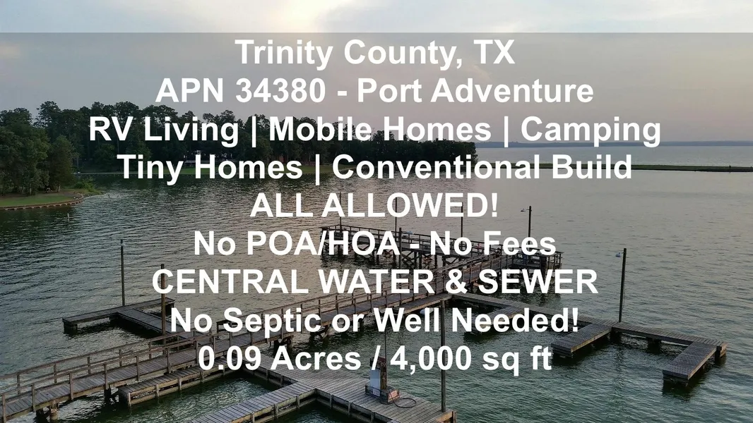 Gorgeous lot in Port Adventure right at the top of Lake Livingston with access to city utilities ready for meter installation at the road including Power, Water, and Sewer. No POA/HOA to worry about! No fees!