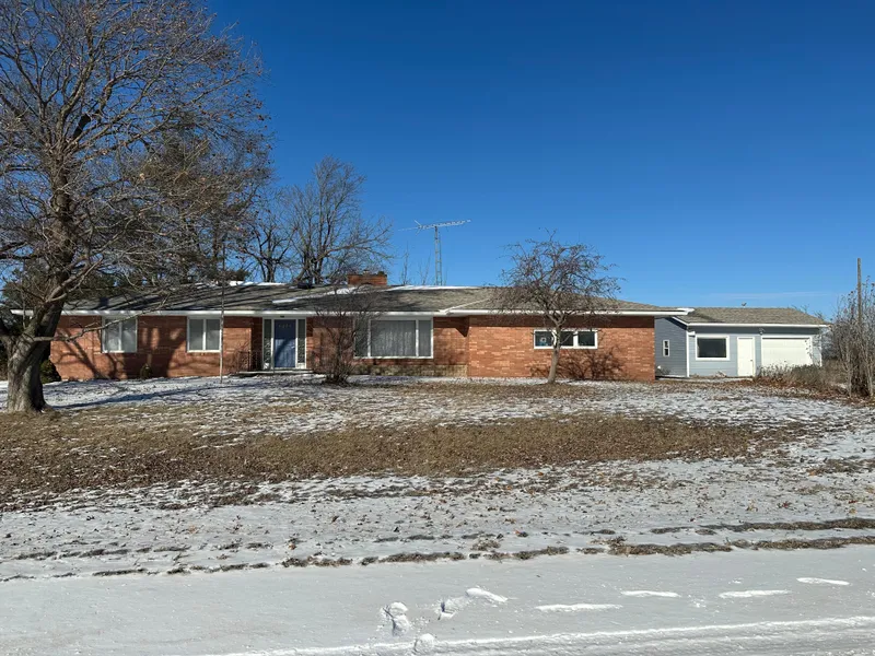 Charming country brick ranch situated on 37.8 acres featuring a pond, outbuilding, and tillable acres currently used for hay ground. This well-maintained 1,496 sq. ft. home offers 3 spacious bedrooms and 2 baths, a roomy living room with a wood-brick surround fireplace, a dining room, and a kitchen with space for a small table. Beautiful hardwood floors run through the bedrooms and hallway, and an additional heated room off the dining area provides flexibility for a home office or extra bedroom.