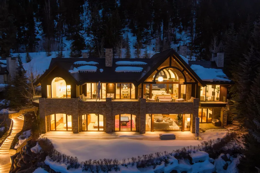 Additional features include a gym, indoor and outdoor water features, 1,500 bottle wine cellar and four bars. The garage holds a total of four cars and has a turntable to allow for easy in and out access. The property also enjoys approximately 3 acres of common space shared with the neighboring house and outstanding views of Red Mountain and Independence Pass.