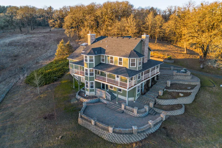 Truly astonishing views from this custom, private hilltop estate located within the Van Duzer Corridor AVA! Overlooking the Cascade Mtns, nearby vineyard, and Valley below, this stately 3,921 SF home offers well placed decks, beautiful stone patios, and view windows to capture it all. With spacious open living areas, 5bd + office, 4ba, updated kitchen, new roof and carpets, 2-fireplaces w/woodstove inserts, and full finished basement there is plenty of room to enjoy. The property includes fenced pasture areas, 73-ac cropland, oak savanna, 30x48 shop, and 36x48 barn + 8x48 lean-to. Well positioned in Oregons wine country with easy commute to Salem, McMinnville, and the Oregon Coast. Perrydale water service + backup well with holding tank.